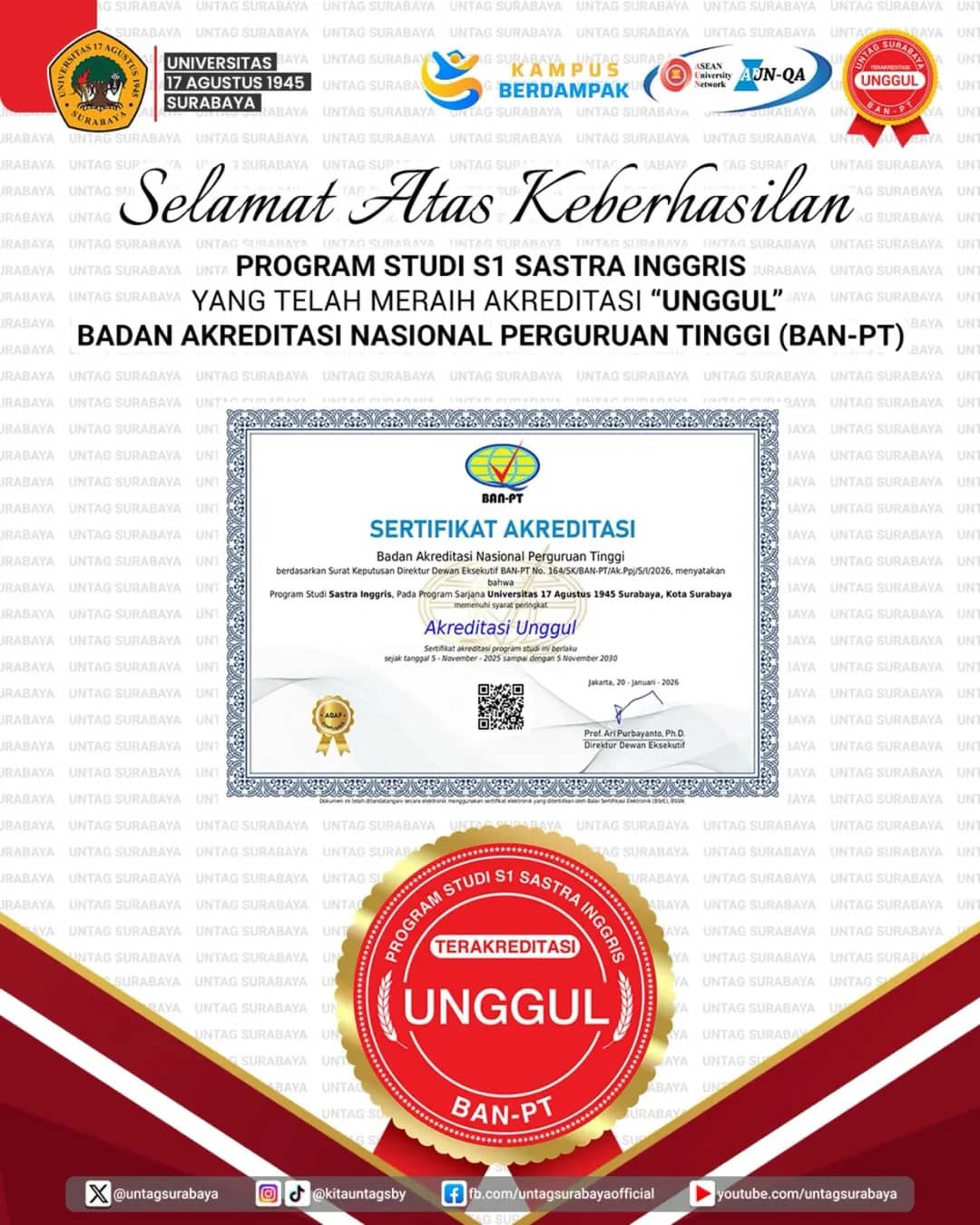 Universitas 17 Agustus 1945 Surabaya Raih Akreditasi “Unggul”, Prodi S1 Sastra Inggris Tegaskan Komitmen Mutu Pendidikan