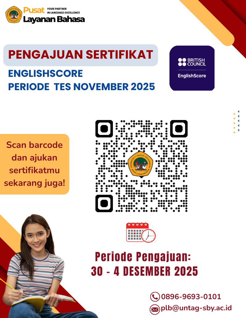 PLB UNTAG Surabaya Buka Pengajuan Sertifikat EnglishScore Periode Tes November 2025